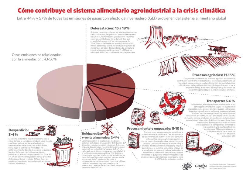 El primer artículo de este capítulo se titula “Cómo contribuye el sistema alimentario agroindustrial a la crisis climática”. En este artículo, contra el consenso existente en las negociaciones internacionales sobre cambio climático de que la agricultura contribuye entre 10 y 15% de la emisión antropogénica de gases con efecto invernadero (GEI), GRAIN nos invita a mirar el panorama completo y a captar de forma total el sistema alimentario industrial: desde la deforestación asociada a la ampliación de la frontera agrícola hasta el desperdicio alimentario, pasando por el uso de fertilizantes, el transporte global de alimentos, la refrigeración y el procesamiento y empacado. Visto el panorama completo, tenemos que “el sistema agroalimentario global actual, impulsado por una poderosa industria alimentaria trasnacional, es responsable de cerca de la mitad [entre 44% y 57%] de todas las emisiones de GEI producidas por humanos” (p. 8). Sin embargo, aun cuando se tomara por cierta la cifra parcial de que la agricultura contribuye sólo con 10-15% a las emisiones de GEI, dicha cifra puede ocultar más de lo que dice y puede conducir a recargar las responsabilidades sobre la devastación ambiental homogéneamente sobre la agroindustria y los campesinos, cuando en realidad la mayor parte de las emisiones directamente vinculadas a los procesos agrícolas “son generadas por las prácticas de cultivo industrial que se basan en fertilizantes químicos (con nitrógeno), maquinaria pesada que funciona con gasolina, y en operaciones industriales de crianza animal altamente concentradas que bombean a la atmósfera desechos de metano” (p. 6).