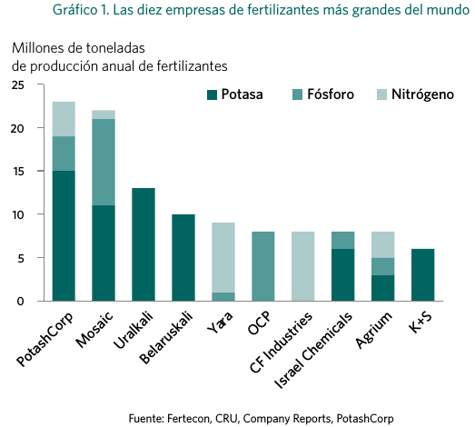 En este artículo se apunta también que la industria de fertilizantes está dominada por un puñado de corporaciones que controlan el mercado global de fertilizantes nitrogenados, de potasio y de fosfatos. Las corporaciones de la industria de los fertilizantes se han aliado con otras grandes empresas relacionadas con el sector agrícola (como Nestlé, Pepsico, Kellog's, Syngenta y Monsanto) para cabildear en favor de sus intereses en lo relacionado a las políticas sobre cambio climático. “Todas estas mismas corporaciones, agencias, grupos de fachada y alianzas han confluido en un esfuerzo común para promover la 'agricultura climáticamente inteligente' como la respuesta oficial al cambio climático. Es un concepto abstracto que se basa en nociones igualmente abstractas, promovidas anteriormente por la industria de fertilizantes para presentar a los fertilizantes químicos como parte de la solución al cambio climático, tales como 'desarrollo agrícola climáticamente compatible' e 'intensificación sustentable'” (p. 23).