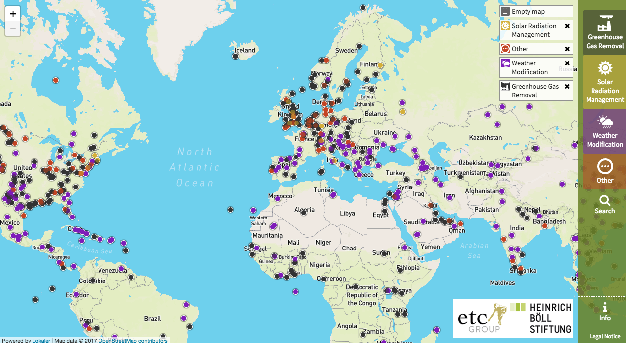 Este mapa interactivo de geoingeniería, preparado por el Grupo ETC y la Fundación Boell es un intento por denunciar el estado mundial de la geoingeniería, mostrando el alcance de la investigación y experimentación. No existe registro completo de los proyectos de control climático y meteorológico, de modo que este mapa es necesariamente parcial.