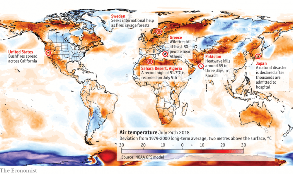 En el verano 2018 se han registrado temperaturas inusualmente altas sobre todo en varios países del norte de Europa -pero también en Grecia, Japón, Estados Unidos y Omán-, causando efectos negativos como la muerte de personas afectadas por las olas de calor, reducciones de la productividad de los trabajadores y el saqueo y la destrucción de los cultivos agrícolas. Otro aspecto relevante es que las olas de calor son más intensas y más frecuentes que en el pasado, tanto el lejano como el cercano.