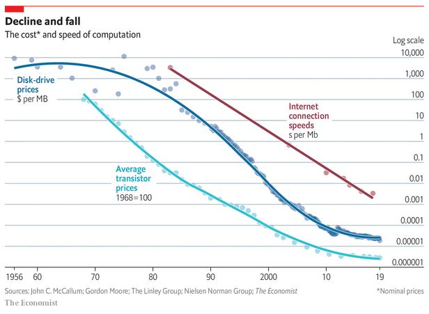 Cabe mencionar que el abaratamiento de los componentes e infraestructura de computadora ocurrió rápidamente en un proceso de unas cuantas décadas y se vio impulsado por el desarrollo de micro componentes para teléfonos inteligentes, reduciendo el precio 100 mil veces al que se tenía en sus inicios, de manera paralela se abarató la industria de las telecomunicaciones que permitió la interconexión de computadoras y el último elemento del proceso fue la aparición de programas de inteligencia artificial para dar sentido a la información, lo que en conjunto ha permitido el desarrolló y expansión de computadoras hasta el IoT.