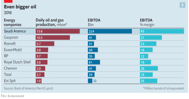 1. Las ganancias totales de Saudi Aramco en 2018 fueron 111 mil millones de dólares, cifra superior a la ganancias de las 5 compañías internacionales más grandes: BP, Chevron, ExxonMobil, Royal Dutch Shell y Total.