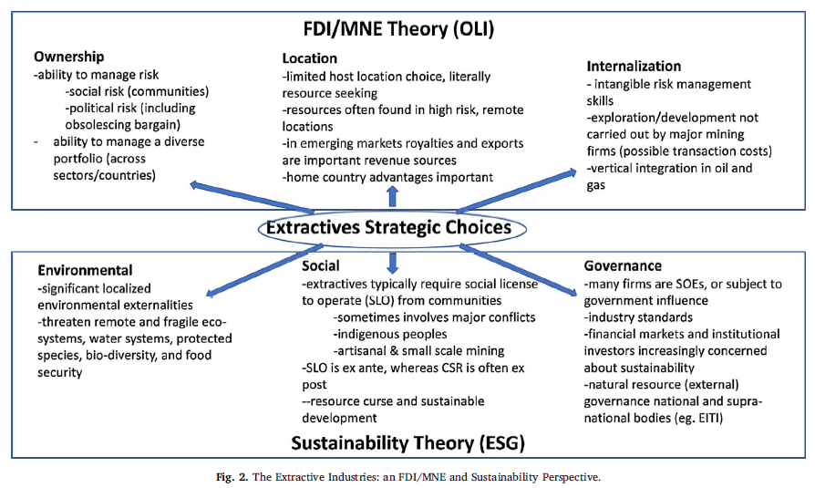 Sin embargo, las industrias extractivas y los recursos naturales juegan un papel limitado en la bibliografía comercial internacional actual a pesar de que la bibliografía más temprana sobre las EMN (Empresas Multinacionales) a menudo fue impulsada por la experiencia de las empresas basadas en recursos naturales. Los autores primero definen cuidadosamente el sector extractivo y sus características. Luego cuestionan si estas características específicas se pueden acomodar dentro de la teoría de la inversión extranjera directa, que es considerado por los autores como el "paradigma ecléctico", y los enfoques actuales de las estrategias de sostenibilidad de las empresas, que resumen a través del marco medioambiental, social y de gobierno. Sus conclusiones se resumen en un marco que abarca tanto la teoría de la IED como los elementos de sostenibilidad del marco medioambiental, social y de gobierno.