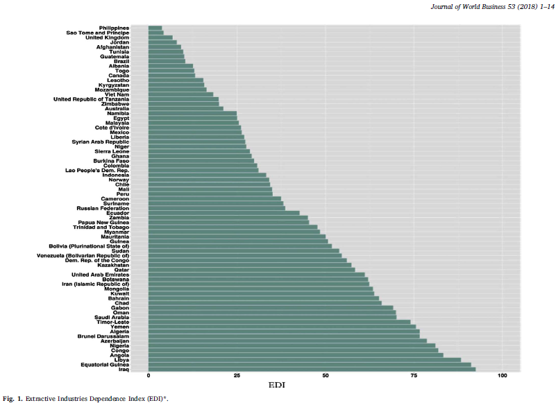 La gráfica muestra 73 países que dependen de actividades industriales extractivas medidos con el índice EDI (que mide la participación de los ingresos de exportación de los extractivos en los ingresos totales de exportación, la participación de los ingresos de los extractivos en el total fiscal de ingresos y el valor agregado de la industria extractiva en el PIB). Los países más altos en el ránking son Irak, Guinea Ecuatorial, Libia, Angola y el Congo (todos ellos arriba de 75 puntos); México se encuentra en el lugar 51 con poco más de 25 puntos.