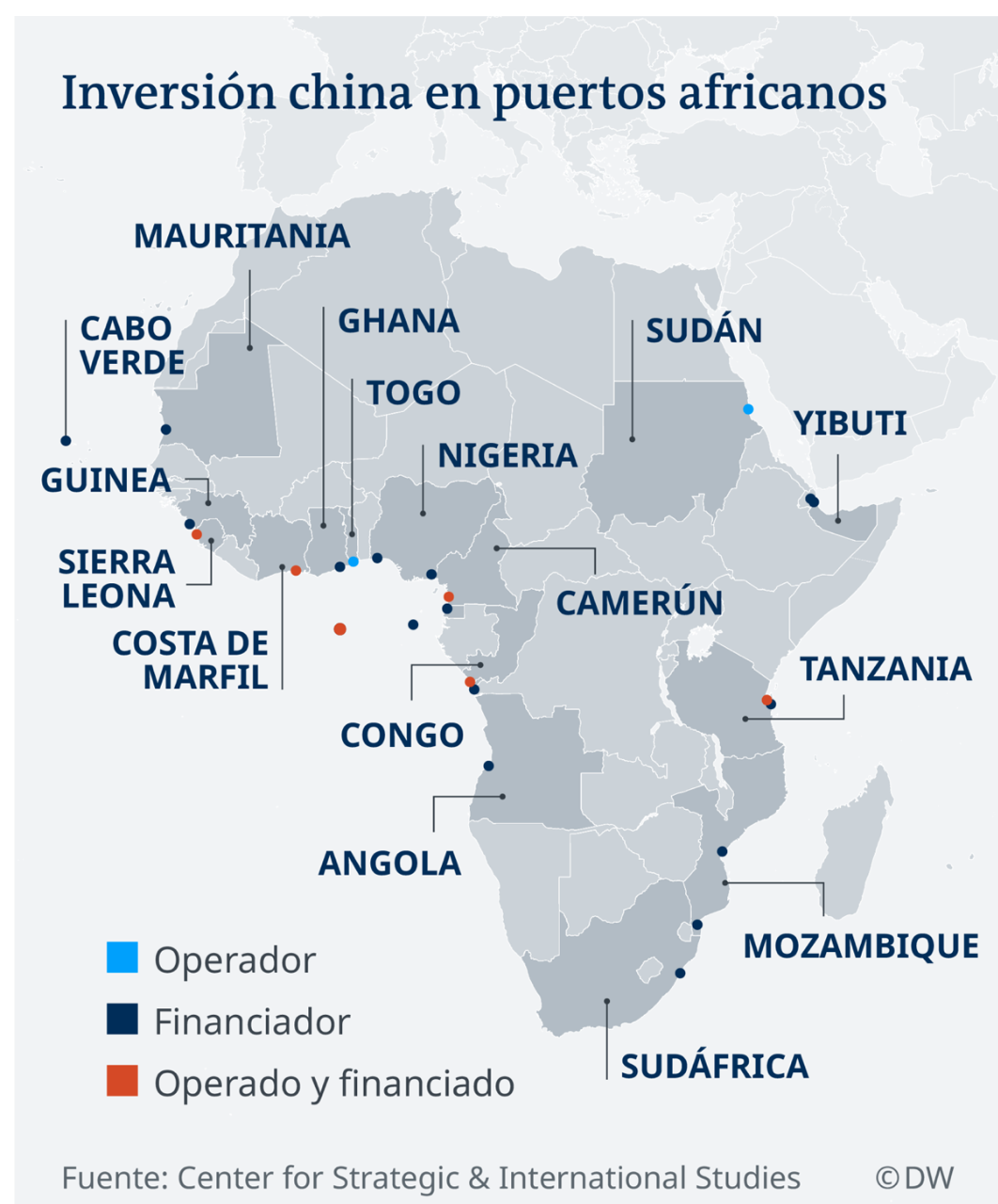 Mapa con la inversión de China en puertos de países africanos, mostrando su papel como operador, como financiador, o como operador y financiador.