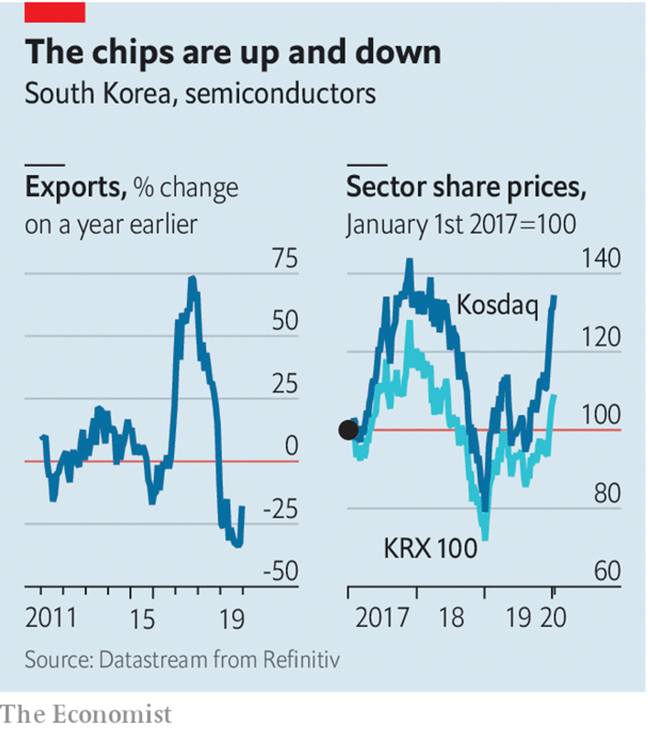 The Economist afirma que el ciclo económico y el flujo de los mercados han cambiado para bien desde mediados de 2019, con base en el comportamiento de los centros de manufactura asiáticos, en específico la industria de los semiconductores.