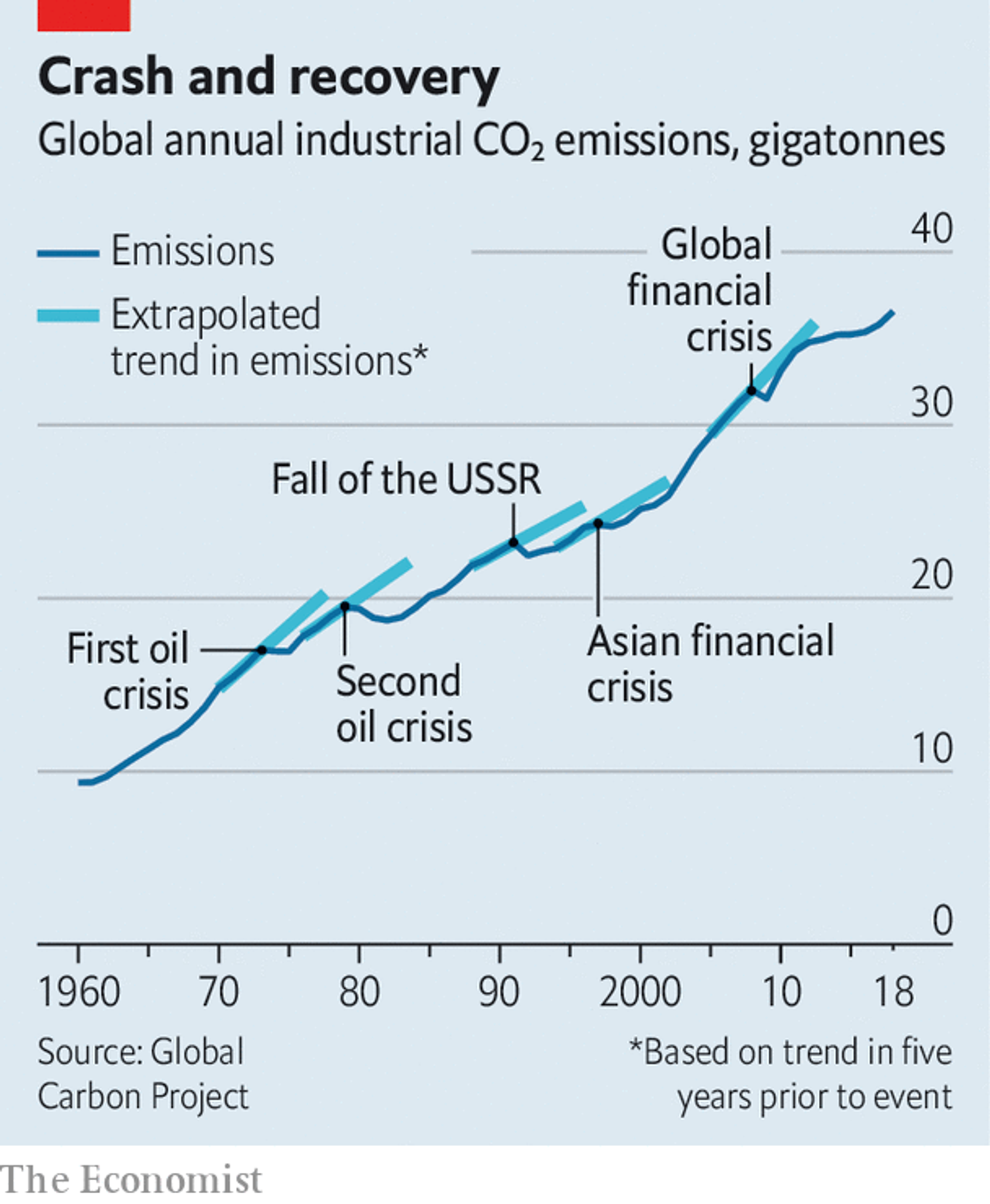 The Economist menciona dos incógnitas de las que depende el resultado que tendrá el Covid-19 para el cambio climático: la primera es cuánto se va prolongar, la segunda, como van a reaccionar lo gobiernos para sacar adelante sus economías. The Economist señala un camino fácil y perezoso, en la cual los gobiernos gasten dinero en las versiones establecidas de las industrias de construcción, transporte y energía. Y menciona otro camino en el que se elija invertir dinero para impulsar versiones más amigables con el ambiente de estas industrias al utilizar más energía solar y nuclear, dinero para investigaciones de baterías de combustibles alimentadas con hidrógeno o premios en efectivo por hacer cemento o acero sin liberar carbono y cambios de esta índole.