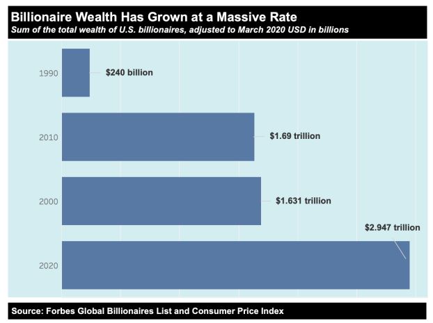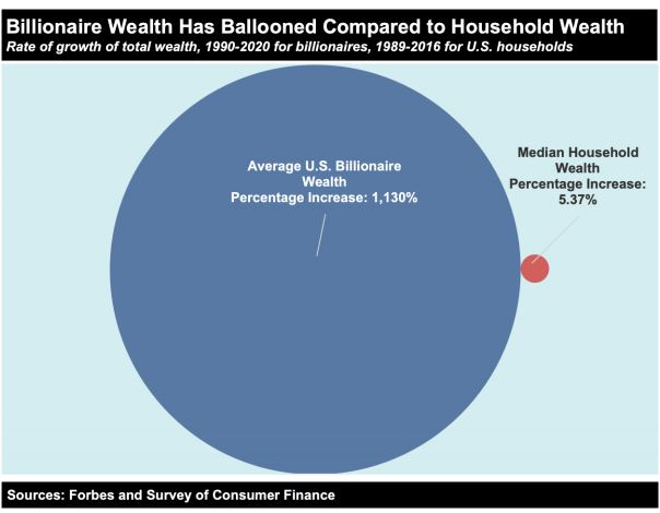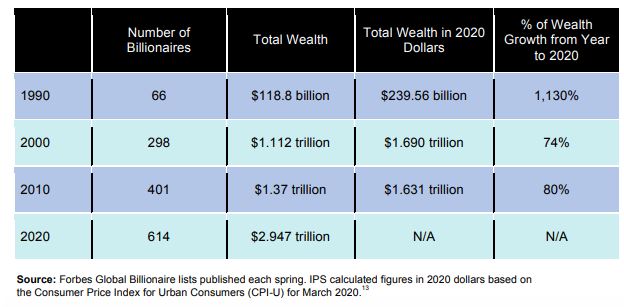 Los autores ofrecen una serie de datos para contrastar las enormes diferencias entre la riqueza de los multimillonarios y el resto de la sociedad. Por ejemplo, en 1990 Estados Unidos tenía 66 multimillonarios con una riqueza de 118.8 mmd, y en 2020 su número era 614 y poseían una riqueza conjunta de 2.947 billones de dólares (bd), esto es, un incremento de 1 130%. En contraste, la riqueza de los hogares creció 5.37% entre 1989 y 2016.