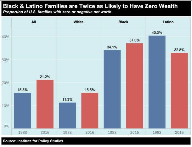 A diferencia de los multimillonarios, millones de familias estadounidenses no sólo no ven aumentos en su riqueza sino que sus deudas van hacia arriba. Por ejemplo, la proporción de hogares cuya riqueza no creció o fue negativa pasó de 15.5% en 1983 a 21.2% en 2016, para las familias latinas el porcentaje fue 32% en 2016 y para los afroamericanos de 37% en el mismo años (Dato crucial 3).