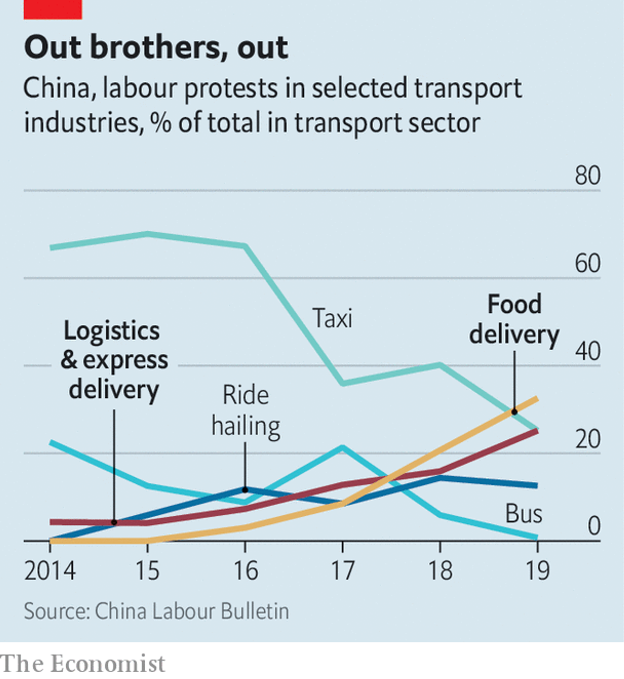 También, la CBS señala que la industria de entrega de comida se ha convertido en la mayor fuente de disturbios laborales. La primer huelga del sector fue en 2016, pero en 2020 ya se cuentan 121 debido a recortes salariales, retrasos en los mismos y multas. Sin embargo, debido a que estos no son empleados formales pueden ignorar sus quejas, como el trabajador de Ele.me que en 2018 fue vetado de la plataforma por hacer huelga dos días debido al bajo salario. Pero debido a la simpatía de la gente hacia estos, prefieren evitar disturbios de su fuerza laboral. Por ello, la compañía Meituan creo una categoría llamada lepao o conductores felices, los cuales reciben un pago mayor por entregar en lugares lejanos. Esto ayudó a crear una linea de atención para los mismos, la cual durante la pandemia ha pagado 300 mil yuanes para aquellos afectados con Covid-19.
