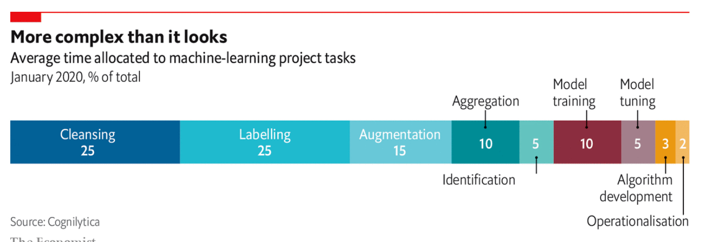 Según Cognilytica, una consultora especializada en IA, transformar los datos “crudos” en datos aptos para el sistema consume 80% del tiempo de los proyectos de IA. Para entrenar un sistema de aprendizaje automático se requiere del etiquetado de ejemplos, generalmente hecho por seres humanos. Generalmente, las grandes compañías de tecnología hacen este trabajo de forma interna, mientras que las compañías que carecen de los recursos o la experiencia requerida recurren a contratistas externos para realizar estas tareas. La compañía china MBH, por ejemplo, emplea a más de 300 000 personas para etiquetar imágenes de rostros, o escenas callejeras o radiografías médicas, para que estas puedan ser procesadas por las computadoras. Mechanical Turk, una subdivisión de Amazon, conecta a empresas con un ejército de trabajadores eventuales a quienes se le paga a destajo para realizar estas tareas.