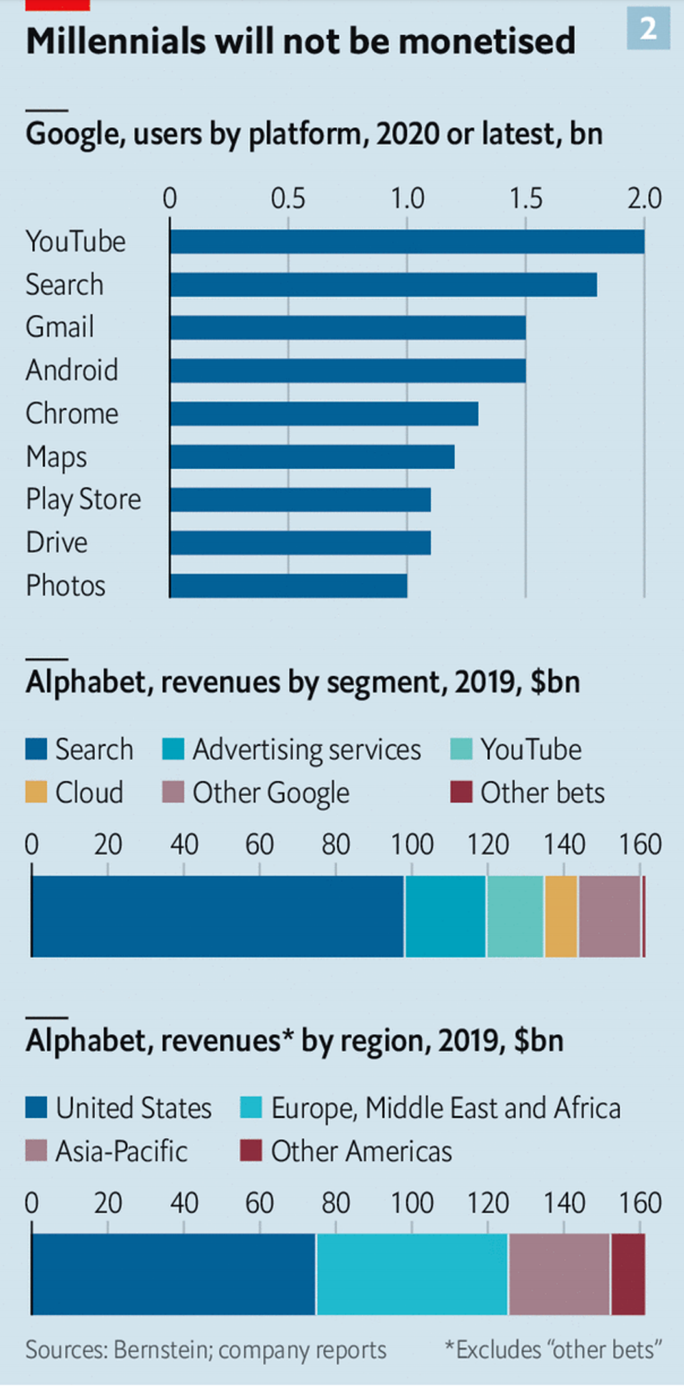 Aunque estos datos podrían sugerir que Alphabet es un “poni de un solo truco”, para The Economist es en realidad una manada de ponis, algunos de los cuales parecen caballos en plena madurez. Nueve de las aplicaaciones y servicios de Alphabet tienen más de mil millones de usuarios a nivel mundial. Se estima que diariamente se realizan, más de 6 mil millones de consultas en Google y 49 años de video son subidos a Youtube, 300 mil millones de correos son enviados, de los cuales un tercio se origina en Gmail.
