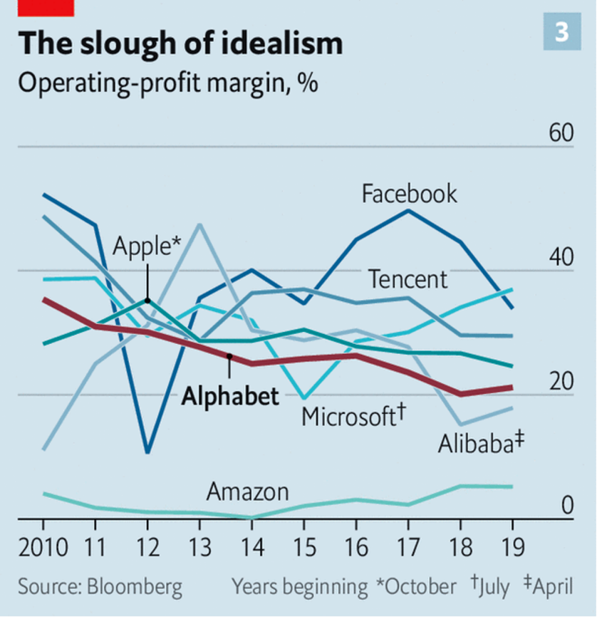 Aunque nada de esto solía importar en el pasado, siempre y cuando Google tuviera la red de seguridad de su negocio publicitario debajo de sus atrevidas innovaciones, últimamente se ha convertido en un problema, ya que ha reducido los márgenes y debilitado el desempeño bursátil por debajo de sus rivales del Big Tech. Si bien, el negocio de publicidad en línea de Google continúa generando 60% de todas sus ganancias, se ha ralentizado. En 2018 las ventas de esta división crecieron 22% pero en 2019 sólo 15%. Según expertos, la búsqueda general en línea está siendo desplazada por búsquedas especializadas. Se estima que alrededor del 60% de las búsquedas de productos ahora comienzan en Amazon (cuyo negocio de anuncios en línea ha crecido rápidamente para colocarse solo después de Google y Facebook).