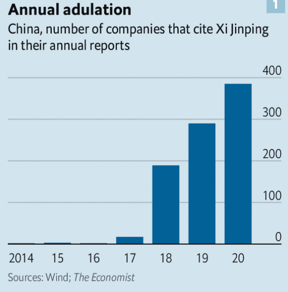 Según los informes anuales de muchas empresas chinas, “el pensamiento de Xi Jinping sobre el socialismo con características chinas para una nueva era” es una panacea empresarial. Casi 400 de las 3 900 empresas que cotizan en las bolsas de China rindieron homenaje al Partido Comunista, y a su líder, en sus informes anuales, y las referencias, tanto de las compañías estatales como del sector privado, a la orientación de Xi han aumentando significativamente desde 2017. Esta tendencia es una muestra del control que el PC ejerce sobre todos los aspectos de la vida en China, y del control que Xi, a su vez, ha ganado sobre el Partido. Según The Economist, Xi está en una posición desde la cual puede rediseñar la economía en la que estas compañías pueden prosperar o fracasar.