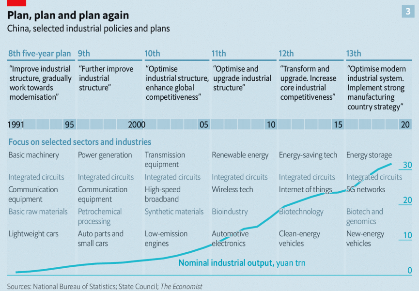 Durante mucho tiempo se ha manejado una visión idealizada de la política industrial china, en donde los mandarines deciden lo que se necesita y aplican una combinación de capital barato, prioridades de investigación específicas, robo de propiedad intelectual, proteccionismo y fuerza bruta, si hace falta, para lograrlo. En realidad, la política industrial china nunca alcanzó ese grado de coherencia. Promovió en el pasado la industrialización de cualquier tipo, donde las ciudades acaban compitiendo entre sí para atraer empresas y las empresas se amontonan donde creen que habrá un boom. Estos patrones de inversión han tenido poca relación con la política industrial, más bien esta se ha adaptado a los hechos. Si bien, a veces ha funcionado, las décadas de esfuerzos oficiales en desarrollar la industria de semiconductores o vehículos de combustión interna ha fracasado. El precio que se pagó por el crecimiento de otros sectores, como la energía solar o los astilleros, fue muy alto y trajo consigo un exceso de capacidad, grandes pérdidas y brutales consolidaciones.