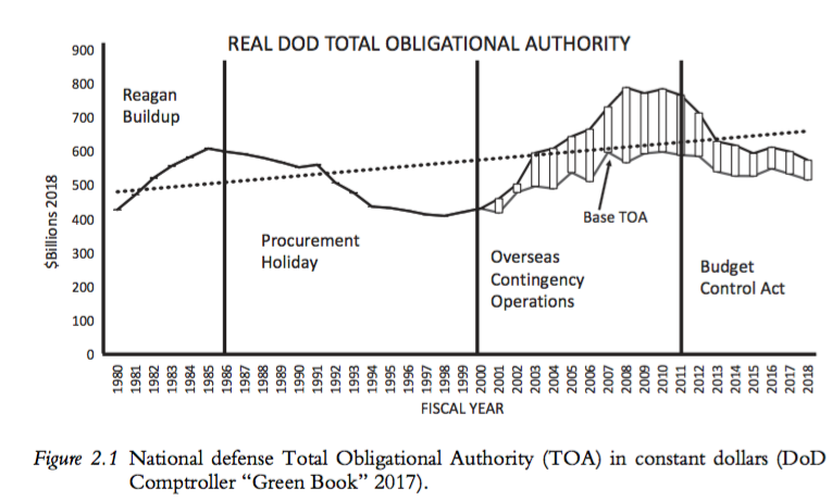 La industria de defensa estadounidense depende mayoritariamente del presupuesto del gobierno estadounidense. La gráfica 1 divide los gastos de defensa entre 1980 y 2018 en cuatro períodos: 1) la administración de Reagan en la década de 1980; 2) el declive posterior a la Guerra Fría; 3) varias operaciones de contingencia luego de los ataques al World Trade Center en 2001; y 4) la Ley de control presupuestario de 2011.