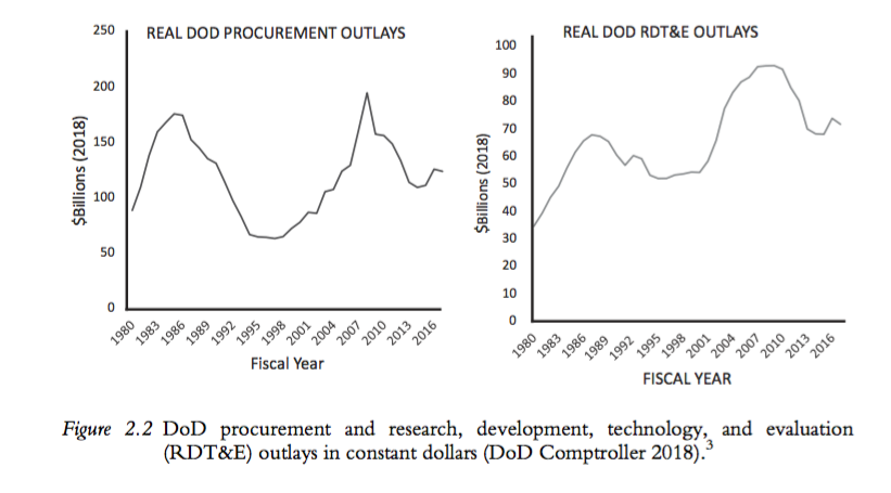 Con el final de la Guerra Fría los presupuestos de defensa de Estados Unidos disminuyeron constantemente. Esta tendencia se corroboró con el programa Reagan Buildup, con el que se recortó el gasto en adquisiciones, lo que significa que los presupuestos de defensa menores que se muestran en la Gráfica 2 afectarían más la base industrial de defensa.