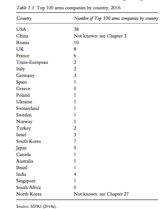 Asimismo, la lista de SIPRI, "Principales 100 empresas productoras de armas", ofrece una serie de datos completa y disponible sobre productores de armas y empresas de servicios militares. Esta incluye los nombres de cada productor de armas, país sede, ventas anuales de armas a precios corrientes y las totales, así como las ganancias totales de la empresa y el empleo total. No obstante, la lista no incluye empresas dedicadas a las unidades de mantenimiento de las fuerzas armadas. Esta base de datos se creó en 1989 y contiene información desde 2002 (incluyendo a las compañías de armas rusas). Los autores reconocen que la investigación que presentan no hubiera sido posible sin la base de datos de SIPRI (ver Dato crucial 1). El estudio incluye capítulos de 4 países que no aparecen en el listado de SIPRI: China, Corea del Norte, Grecia y Sudáfrica.