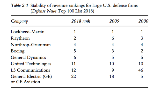 A pesar de la ola de fusiones, las empresas estadounidenses continúan ocupando un lugar destacado en los primeros 10 lugares a nivel mundial, medidos por sus ingresos. Cinco empresas aparecieron en el top 10 en la clasificación de 2018 y siete en 2009 y 2000. Las cinco grandes líderes de la industria (Lockheed-Martin, Raytheon, Northrop-Grumman, Boeing y General Dynamics) aparecen con regularidad en la lista de las 10 principales empresas de defensa.