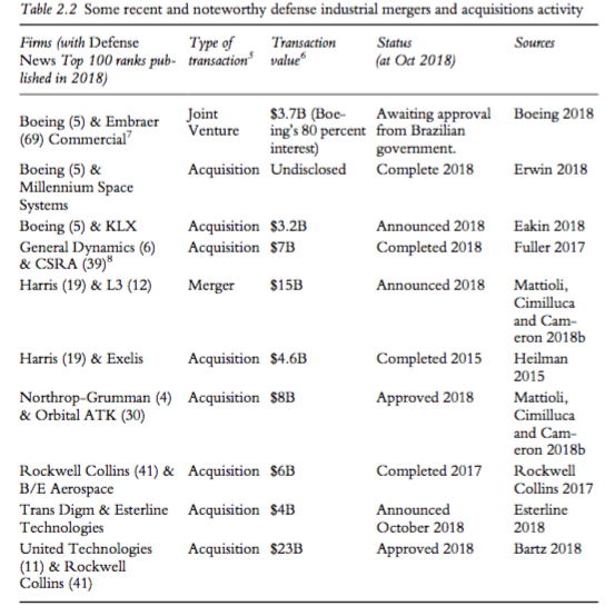 En 1993, el secretario de Defensa Leslie Aspin, planteó que era necesaria una consolidación industrial: los principales actores de la defensa necesitaban consolidarse para sobrevivir y el DoD facilitaría el proceso ofreciendo incentivos financieros. Los autores de este capítulo consideran que ese suceso fungió como ratificación, fomento y aceleración de una tendencia a largo plazo hacia la consolidación en las industrias de defensa.