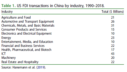 2) En 2018, la inversión extranjera directa estadounidense en China ascendió a las 7 100 transacciones de inversión que abarcaron 1 400 corporaciones transnacionales. De esas 1 400 corporaciones, 330 hicieron inversiones que excedieron los 100 millones de dólares y, 71 hicieron inversiones que rebasaron los mil millones de dólares. El Departamento de Comercio de Estados Unidos estima que en 2018 el valor total de las inversiones estadounidenses en China fue de 727.1 mil millones de dólares; si Hong Kong es incluido, el valor asciende a 1.172 billones de dólares.