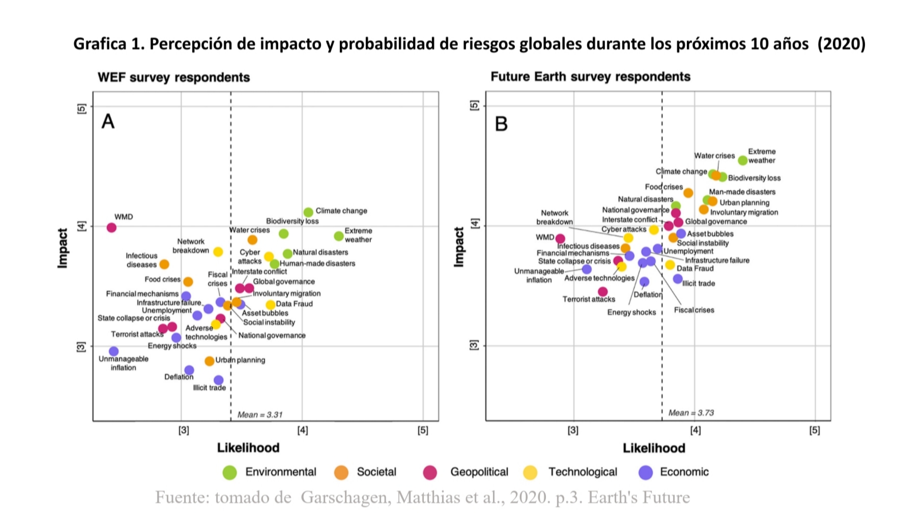 Estos riesgos se clasifican según su probabilidad. Los valores son: 1= muy improbable, 2= algo improbable, 3= algo probable, 4= probable, 5= muy probable; y según su impacto. La escala de impacto para la encuesta de WEF es: 1= mínimo, 2= menor, 3= moderado, 4= severo y 5= catastrófico. La escala de impacto que empleó Future Earth es: 1= insignificante, 2= menor, 3= moderado, 4= mayor y 5= severo.