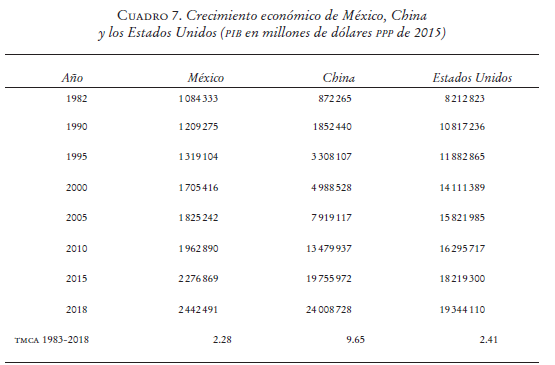 En 1982 la economía mexicana era más grande que la China: el PIB de México ascendía a 1 084 333 millones de dólares estadunidenses, mientras que el PIB de China ascendía a 872 265 mdd. 36 años después, el PIB de China alcanzó 24 008 728 mdd ppp de 2015, mientras que el PIB de México apenas ascendió a 2 442 491 mdd ppp de 2015.