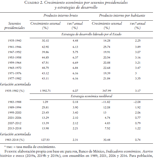 El PIB real de México creció 6.1% anual en el periodo de 1935 a 1982, mientras que en el periodo de 1983 a 2018 sólo creció 2.3% anual.