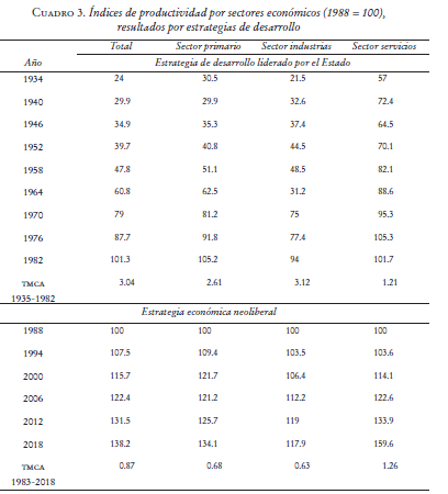En el sector primario, las tasas medias de crecimiento anual de la productividad laboral fueron de 0.7% bajo la estrategia neoliberal (1983-2018) y de 2.6% bajo la estrategia de desarrollo económico liderado por el Estado (1935-1982). En el sector industrial las tasas medias de crecimiento anual de la productividad del trabajo fueron de 0.6% bajo la estrategia neoliberal (1983-2018), contra 3.1% anual bajo la estrategia de desarrollo liderado por el Estado (1935-1982). Sólo en el sector servicios, las tasas anuales de crecimiento de la productividad laboral han sido similares: 1.26% bajo el neoliberalismo y 1.21% bajo la estrategia económica previa.