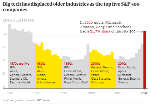 1. De acuerdo con el índice S&P 500, el mercado estadounidense finalizó 2020 con un aumento de 18% en ganancias, del cual, dos tercios fue gracias a los incrementos de valor en las acciones Fangam.