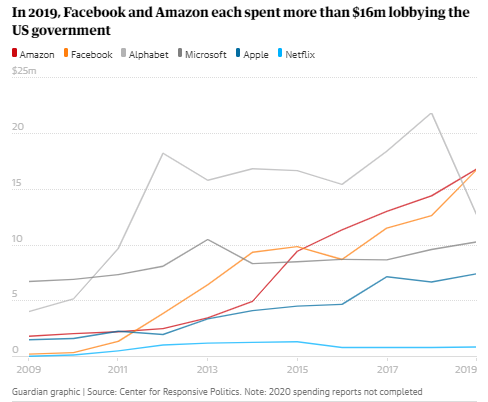 7. Desde 2014, Google es uno de los más grandes donadores de Goldman Sachs. De la misma forma, el US Center for Responsive Politics, reportó que en 2019 las Big Tech gastaron 64 millones de dólares en lobbying en Estados Unidos.