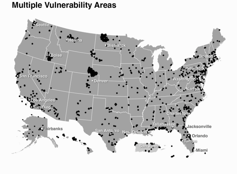 2. Aunque la distribución de las instalaciones militares en peligro no coincide exactamente con las concentraciones más grandes de la población civil de Estados Unidos, ésta es lo suficientemente cercana como para afectar a un gran porcentaje de estadounidenses, incluidos los residentes de Los Ángeles, San Francisco, San Diego,Nueva York, Boston, Filadelfia, Miami y Washington.