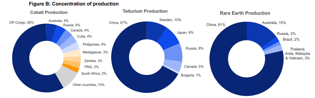Lo anterior, responde a una concentración de la producción y de las reservas de metales, lo cual se ha convertido en uno de los principales peligros para el suministro. Lo mencionado, se debe a que pocos países cuentan con las reservas de recursos, lo que provoca que el precio de los metales sea propenso a sufrir fluctuaciones. Para ejemplificar lo previo, es importante mencionar que tres metales necesarios para las tecnologías renovables se encuentran concentrados en un solo país (cada uno): República del Congo tiene un concentración de 58% del cobalto mundial; por su parte, China sustenta 67% de la producción de telurio y 81% de la producción de tierras raras a nivel internacional.