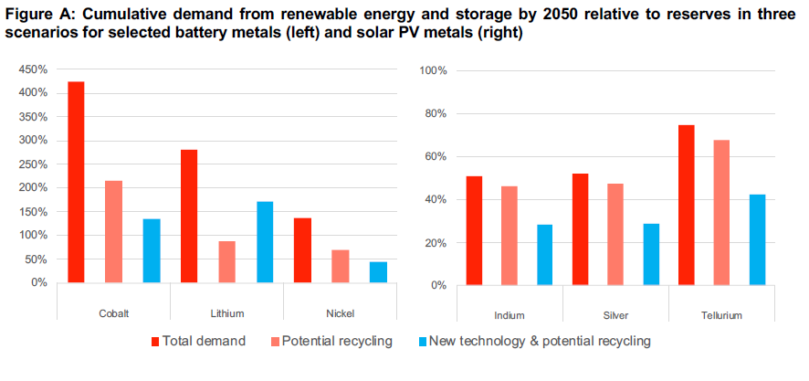 De acuerdo con lo previo, se llegó a la conclusión de que comparado con el número de reservas, la demanda de metales aumentara. En este sentido, se proyecta que la demanda de cobre, litio y níquel para la fabricación de energía renovable, exceda las reservas; asimismo, se prevé un uso de hasta 50% de las reservas totales de plata, telurio e indio. En este caso, el reciclaje se posiciona como la única opción viable para reducir la demanda de extracción de metales.
