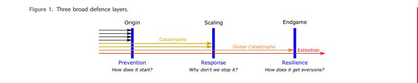 Posteriormente a esto, en el resto del artículo se profundiza en dos consecuencias que resultan relevantes para el riesgo de la extinción humana. En la primera Cotto-Barat, Daniel y Sanberg categorizan las catástrofes por la manera en que es posible frenarlas en las capas de defensa. En la sección 2 se muestra la clasificación de riesgos por origen describiendo la forma en que podrían enlazarse con la capa de protección. En la sección 3 se vislumbran las características que logran el bloqueo de los peligros en la capa de respuesta. En la parte 4, se encuentra la categorización de riesgos en el orden que pueden ser detenidos de provocar la extinción, ésta se encuentra relacionada con las tres capas de defensa.