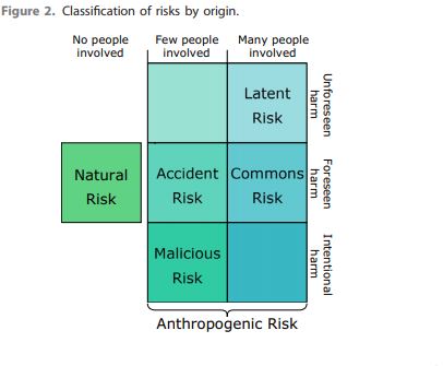 Para que un riesgo evada la “prevención de antecedentes de actividades que provocan un daño, el origen debe estar lejos del control humano”,(Cotto-Barat, Daniel y Sanberg, 2020), es decir, un riesgo natural. Por ejemplo, un gran asteroide, una pandemia que cause un alto índice de mortandad. Es posible implementar estrategias para evitar estos riesgos naturales, como es el caso de los métodos para esquivar asteroides. Pero, para la prevención se necesita de un entendimiento proactivo. Por ejemplo, buscar asteroides que amenacen a la Tierra. “Tales riesgos comparten propiedades importantes con los riesgos antropogénicos”,(Cotto-Barat, Daniel y Sanberg, 2020). Éstos se explicarán a continuación.