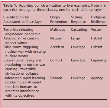 Igualmente, las clasificaciones de este artículo se superponen con las del texto de Governing Boring Apocalypses: A New Typology of Existential Vulnerabilities and Exposures for Existencial Risk Research. En éste los investigadores Hin-Yan Liu, Kristian Cedervall y Matthijs Michiel Maas remarcan la diferencia entre intenciones y otras debilidades o señalan la relevancia de la resiliencia. Pero, el argumento de Cotto-Barat, Daniel y Sanberg apoya a este trabajo cuando pretende profundizar en los peligros existentes y agregar una gran variedad de puntos de intervención.