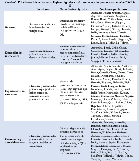 Se debe advertir al lector sobre la ruta seguida en esta investigación. La principal dificultad de estudiar las respuestas tecnológicas digitales frente a la COVID-19 es, como advierte MIT Technology Review, que no existe un repositorio central de información, sino datos dispersos en una amplia variedad de diversas fuentes (Howell et al., 2020). De ahí que en el Cuadro 1 adaptamos la clasificación de iniciativas tecnológicas digitales propuesta por Sera Whitelaw et al. (2020), publicada por la revista Lancet Digital Health y la completamos con fuentes periodísticas y otras bases de información entre las que destacan: COVID Tracing Tracker del MIT; el informe especial de Freedom on The Net 2020 The Pandemic´s Digital Shadow; también COVID -19 Digital Rights Tracker por TOP10VPN a cargo de Andrew Dwyer; la iniciativa Pandemic Big Brother; Compendium of Digital Government Initiatives in response to the COVID-19 Pandemic de Naciones Unidas (UN, 2020) y Fighting the Global Covid-19 Power-Grab de Privacy Internacional.