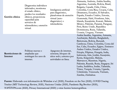 A lo largo del presente trabajo hemos hecho un recuento de las diferentes tecnologías digitales según el objetivo final con el que fueron empleadas: rastreo, detección de infecciones, cuarentena, seguimiento de contactos, gestión clínica y restricciones de internet.