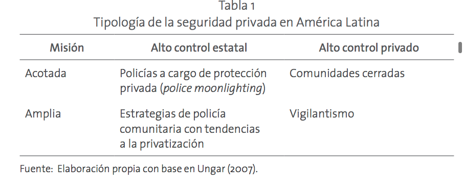 Con la tipificación de Ungar (ver datos cruciales), Padilla apunta que existe el policing moonlighting, donde los policías se encargan de resguardar instalaciones, bienes o personas. No obstante, esto deriva una mala utilización de los impuestos porque no están destinados al fortalecimiento del bien común. Así, se abre la posibilidad de que existan estrategias de policía comunitaria. Y aunque parece una idea positiva, esta idea podría acarrear problemas debido a las debilidad de las instituciones. Asimismo, los esquemas de las policías comunitarias puede generar que se olvide el bien común y las condiciones para realizar un mejoramiento de la seguridad.