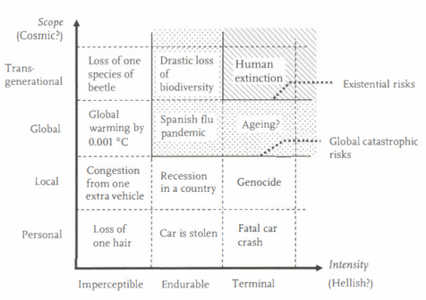 Como se plantea en la figura 1, los ejes pueden expandirse para comprender riesgos conceptualmente posibles que se vuelven cada vez más externos. Hablando de los riesgos transgeneracionales, éstos pueden contener una subcategoría de peligros tan nocivos que no solo perjudicarían a las generaciones futuras humanas, sino al futuro “cono de luz del universo”, (representación del espacio-tiempo, en la teoría de la relatividad espacial) que ayuda a producir seres inteligentes y conscientes de sí mismos. Por otra parte, de acuerdo con varias “teorías de valor” es posible que algunos “estados del ser” resulten ser peores a la muerte. Puede verse un ejemplo de esto con las formas permanentes y extremas de esclavitud o control mental, por lo que sería probable de que el eje x se extendiera hacia la derecha en la tabla, (Figura 1).