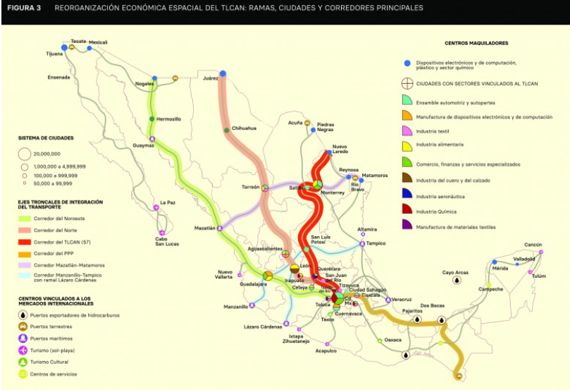 La dinámica de inversiones durante el TLCAN se dirigió principalmente hacia ciudades y corredores económicos, donde se dio una emergencia de plataformas manufactureras de producción-exportación que se vincularon con la cadenas de valor transfronterizas. De este modo se observan importantes procesos de modernización y ampliación de la infraestructura de transporte terrestre, así como de puertos marítimos e instalaciones que posibilitaran el traslado de un gran volumen de mercancías entre México y Estados Unidos. Asimismo, fue importante la organización logística transfronteriza de las empresas sede con su filiales.