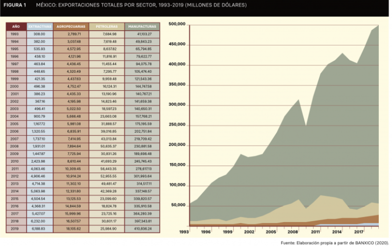 Una de las primeras cosas que ocurrió con el TLCAN fue el cambio en la composición sectorial de las exportaciones mexicanas, pues durante la década de 1990 la presencia de la manufactura rebasó la exportación de hidrocarburos. Así, entre 1994 y 2019, el valor de las exportaciones manufactureras del país se incrementó ocho veces al pasar de casi 50 mil millones de dólares a 410 mil millones de dólares.