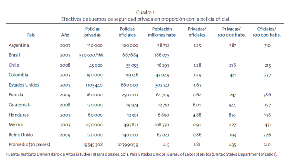 Los estudios disponibles demuestran el crecimiento de los agentes de policía privada con respecto a la oficial como tendencia mundial. No obstante, América Latina es la región donde el ritmo de crecimiento de la seguridad privada es más acelerado y en donde las empresas disponen de un mayor arsenal.