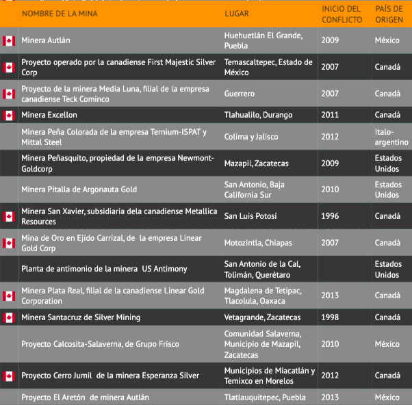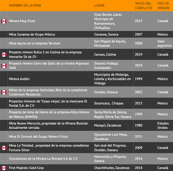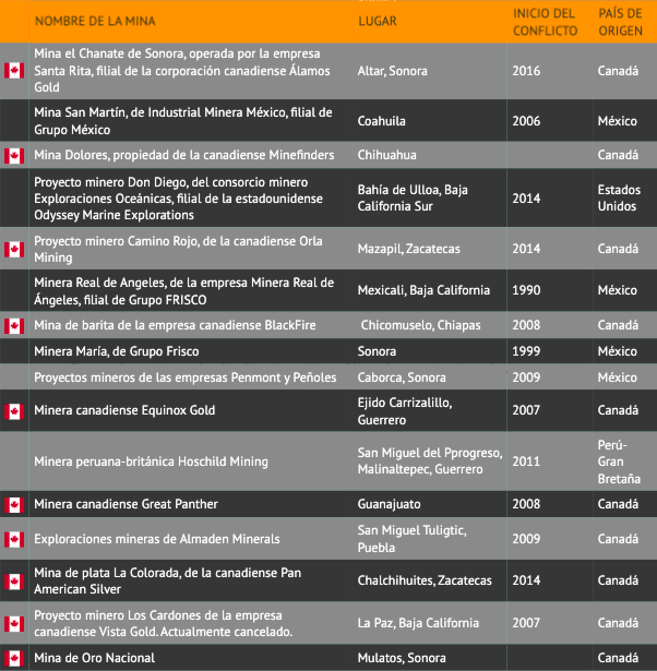 México encabeza la lista de países con el mayor número de conflictos mineros en América Latina, con un total de 58 casos, de los cuales, 29 pertenecen a proyectos de minas canadienses, de acuerdo con el Observatorio de Conflictos Mineros de América Latina. Además, los conflictos mineros representan 173 de los 560 conflictos socioambientales en México, documentados por la Secretaría de Medio Ambiente y Recursos Naturales (Semarnat). “La mayoría de estos conflictos están relacionados con despojos de tierras, violaciones laborales de mineros, afectaciones a los recursos naturales de las comunidades y hasta asesinatos.”