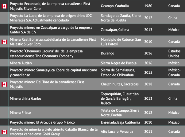 Las mineras de origen canadiende –o que cuentan con capital canadiense–, son las siguientes: Metallica Resources, Minefinders, Great Panther, Black Fire, Alamos Gold, Vista Gold, Linear Gold Corp, Continuum Resources, Gold Group, Almaden Minerals, Fortuna Silver, Excellon Resources, First Majestic Silver Corp, Gabfer, First Majestic Silver Corp , Samalayuca Cobre, MAG Silver, Hematite, Pan American Silver, Álamos Gold, Orla Mining, Equinox Gold, Santacruz Silver Mining y Esperanza Silver.