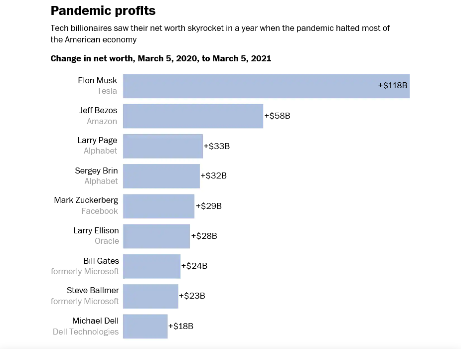Durante 2020, el patrimonio de 9 magnates de la tecnología aumentó en más de 360 mil millones de dólares (mmd). Elon Musk, Jeff Bezos, Mark Zuckerberg, Larry Page y Sergey Brin, Larry Ellison, Bill Gates, Steve Balmer y Michael Dell se beneficiaron del crecimiento de las Big tech en el año de la pandemia, poniendo en evidencia el enorme poder económico que ha alcanzado este sector en Estados Unidos.