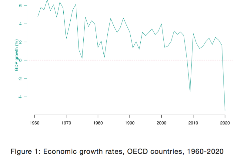 Los autores interpretan este contexto caótico como la representación de metanoia: un giro de la sociedad en contra de toda la gama de aparatos que ya no pueden modelar exitosamente a las personas en “un animal sin otro hábitat que el trabajo asalariado y el capital”. Esto sucede en el marco de décadas de tasas de crecimiento decrecientes y de desempleo (ver Datos cruciales 1 y 2).