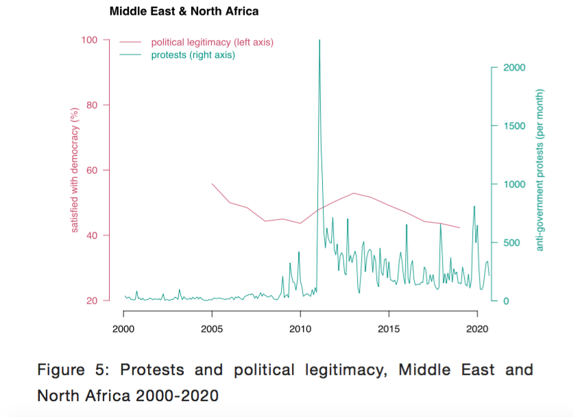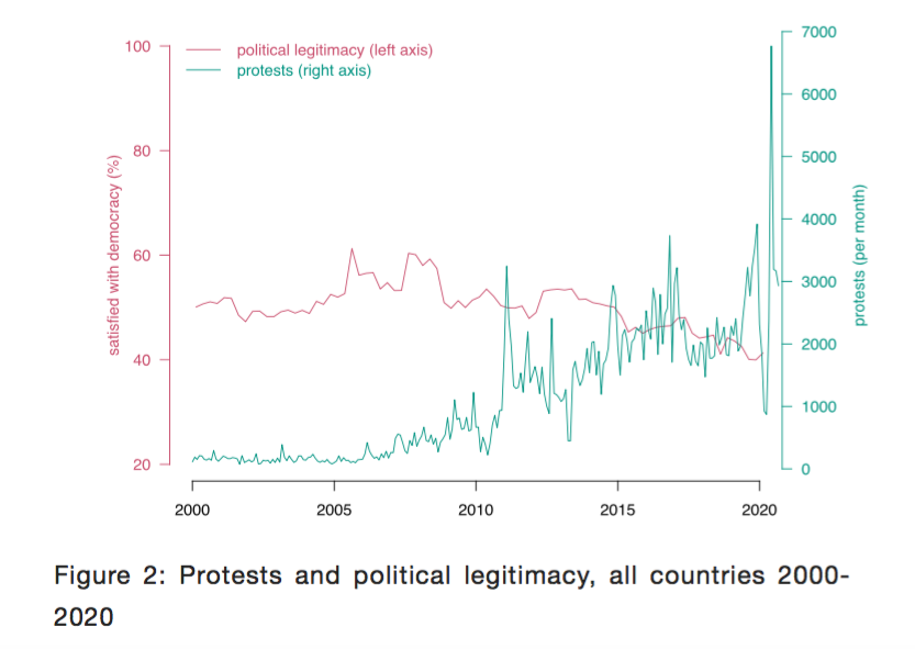 El eje derecho (verde) muestra que entre 2008 y 2019, hubo un aumento de las luchas contra el gobierno en todo el mundo de alrededor del 11%. El eje izquierdo (en rojo) muestra la disminución constante de la legitimidad política desde 2008.