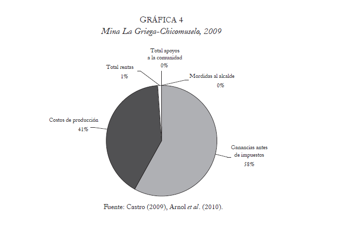 La mina de El Peñasquito, en Mazapil, Zacatecas, propiedad de Goldcorp se instaló sobre los ejidos de Credos, Las Palmas y El Vergel. La escasez de agua fue el principal impacto sobre la comunidad, pues actualmente la mina requiere 13.7 millones de metros cúbicos (m3) al año. La minera convenció a las comunidades de rentar sus tierras por 30 años a cambio de cien millones de pesos, perforación de pozos, construcción de casas, entre otros apoyos. La producción de oro en la zona llegó a 387 500 onzas desde 2009, y la distribución de sus beneficios se muestra en la siguiente gráfica: